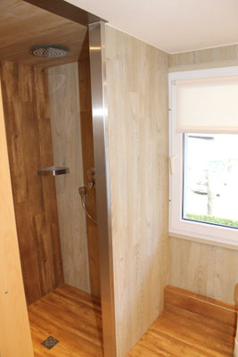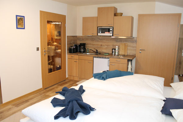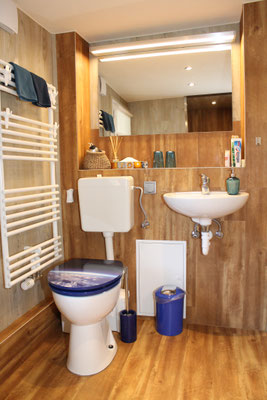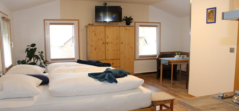 Ein wundervoll bequemes Bett, ein kleines aber feines Bad mit bodenebener Regendusche inklusive Brause, eine vollausgestattete Küchenzeile, eine Sitzecke zum Essen und Spielen oder einfach